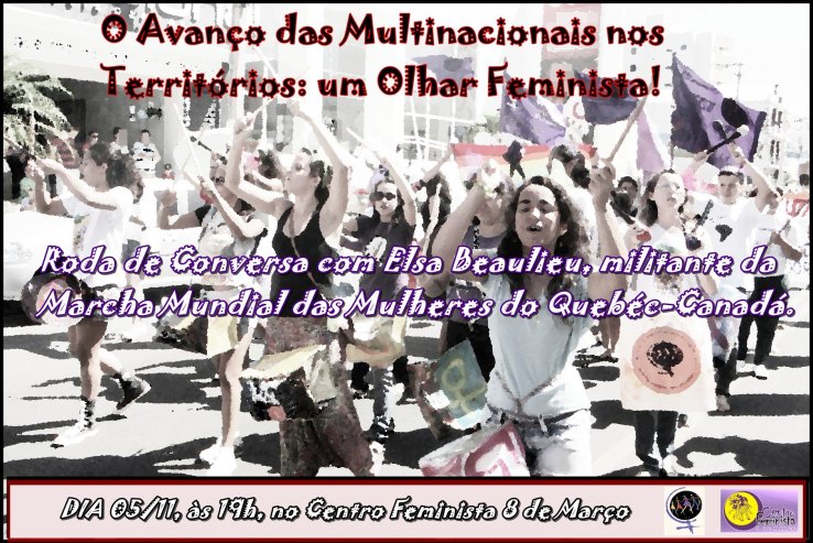 O Centro Feminista 8 de Março promove nesta segunda (5) em sua sede uma roda de conversa cujo tema será “O Avanço das Multinacionais nos Territórios: um Olhar Feminista. A atividade está marcada para ás 7:00 horas da noite e terá como convidada especial a militante da Marcha Mundial das Mulheres de Quebéc – Canadá, Elsa Beaulieu.