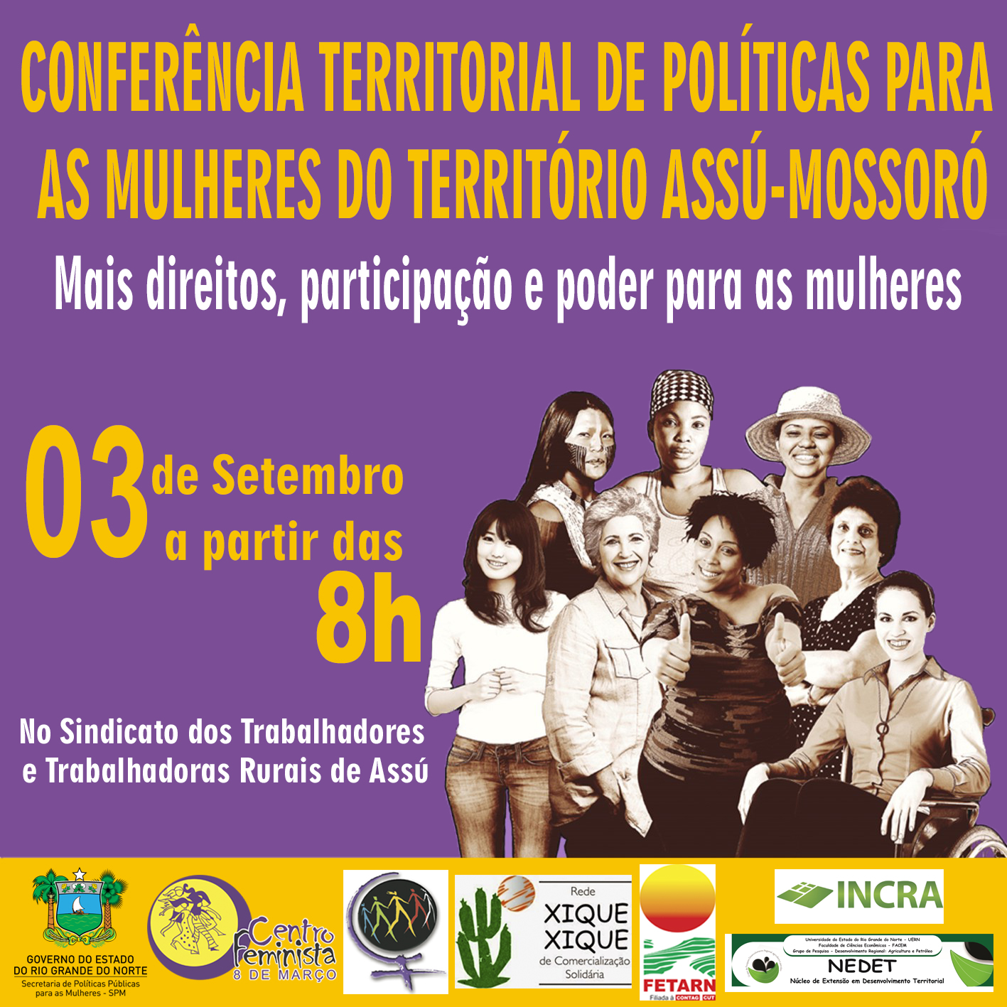 O ciclo de Conferências Territoriais de Políticas Públicas para as Mulheres tem continuidade nesta quinta-feira (03) na cidade de Assú, com a realização da Conferência do Território Assu-Mossoró. A atividade foi convocada pela sociedade civil e será realizada pela Secretaria de Políticas Públicas para as Mulheres do RN (SPM/RN) com o apoio do Centro Feminista 8 de Março, a FETARN, a Marcha Mundial das Mulheres do RN, a Rede Xique-Xique, o INCRA e o Núcleo de Desenvolvimento Territorial (NEDET).