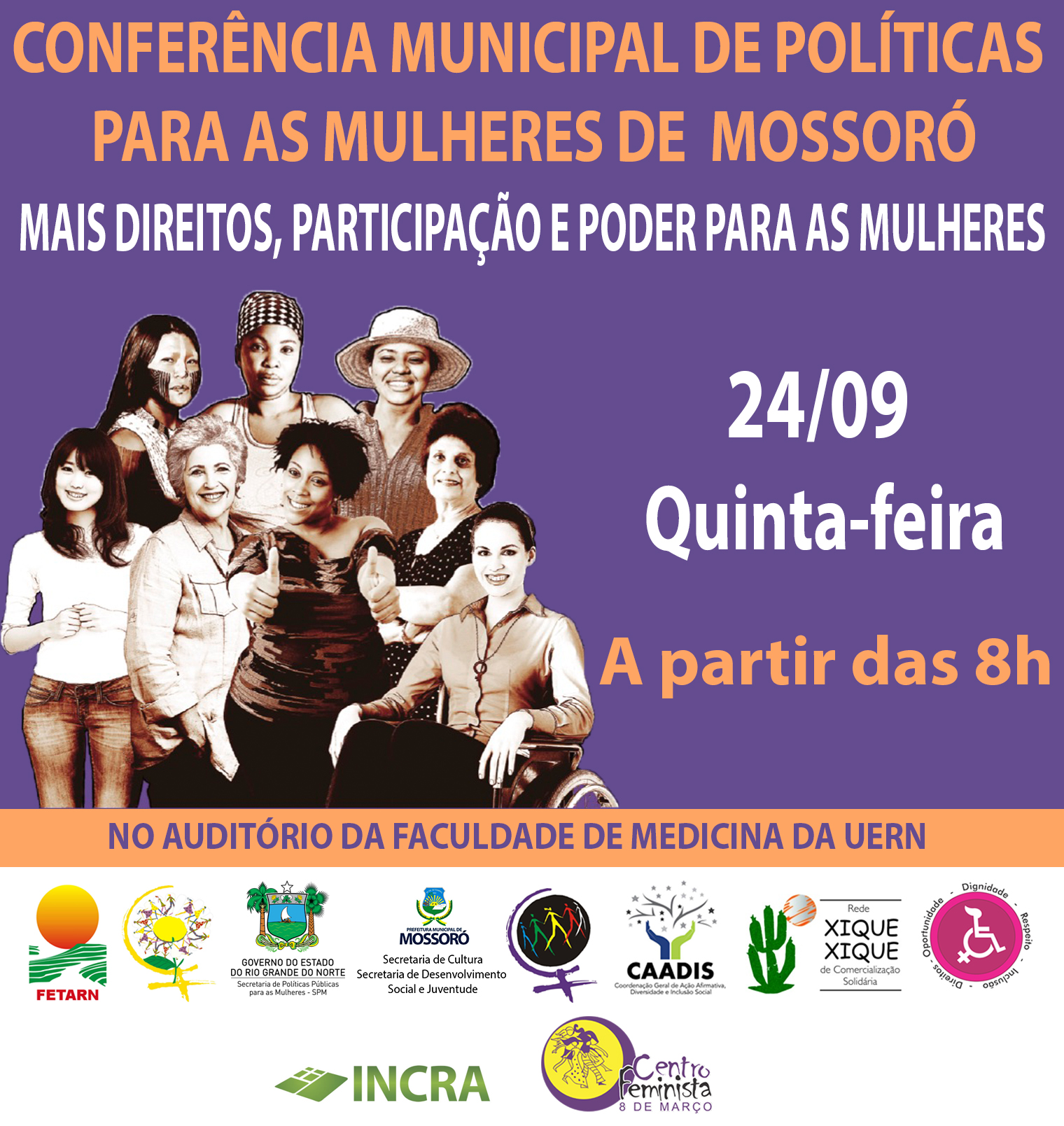 Nesta quinta-feira, 24 de setembro, será realizada a Conferência Municipal de Políticas para as mulheres de Mossoró. A atividade irá acontecer a partir das 8h da manhã, no auditório da Faculdade de Medicina da Universidade do Estado do Rio Grande do Norte – UERN.