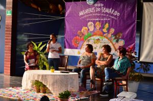 Entendendo o erro que é a visão de combate à seca por só ver as limitações e não enxergar as muitas possibilidades da região semiárida, Glória citou a evolução da mudança desta visão por meio da articulação do semiárido. Em seguida, Conceição Dantas aponta a importância da organização das mulheres nesta mudança e mostra o quintal como espaço de resiliência das mulheres: “enquanto as mulheres não têm domínio sobre as terras do roçado, elas têm a capacidade de fazer do quintal, que é um espaço bem mais reduzido, um espaço que gera muita riqueza com soberania alimentar”. E explica que a auto organização é fundamental neste processo: “uma mulher sozinha fica frágil mas se ela vai se juntando e construindo grupo e movimento, amplia a criatividade, a resistência e a mudança nas suas vidas e na sociedade”.