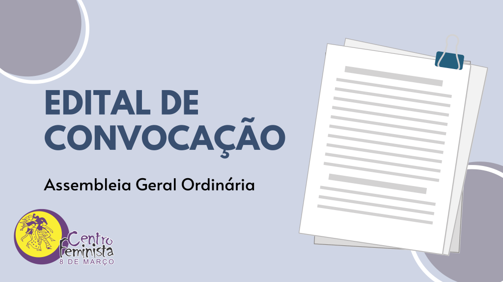 A Diretoria do Centro Feminista 8 de Março convoca suas associadas para participar da Assembleia Geral Ordinária, que será realizada por meio virtual pela Plataforma Zoom no dia 28 de abril de 2021, quarta-feira as 17:00h em primeira convocação, estando presentes a maioria absoluta das associadas e, as 17:30 em segunda convocação, com qualquer número. O link da Assembleia será enviado para o e-mail de suas associadas, estas inclusive poderão solicitar o link pelo e-mail da instituição admin@cf8.org.br.