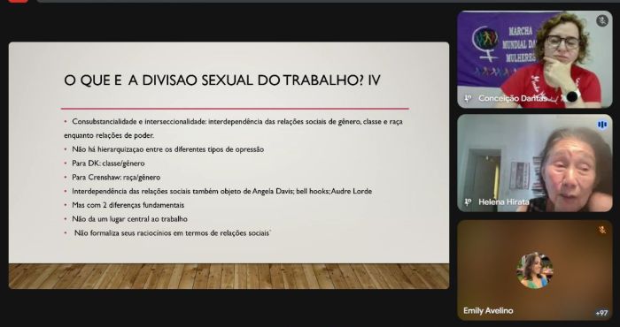 A manhã desta terça-feira (05) foi marcada pelo debate sobre a divisão sexual e racial do trabalho durante a primeira aula virtual aberta da Escola de Formação Feminista, realizada pelo Centro Feminista 8 de Março (CF8) em parceria com o Governo Federal, por meio do Ministério das Mulheres. A atividade foi transmitida ao vivo pelo canal do CF8 no YouTube e contou com a participação da socióloga Helena Hirata (Universidade de Paris), da militante da Marcha Mundial das Mulheres (MMM) e vereadora em Mossoró Plúvia Oliveira, com mediação de Conceição Dantas, do CF8.